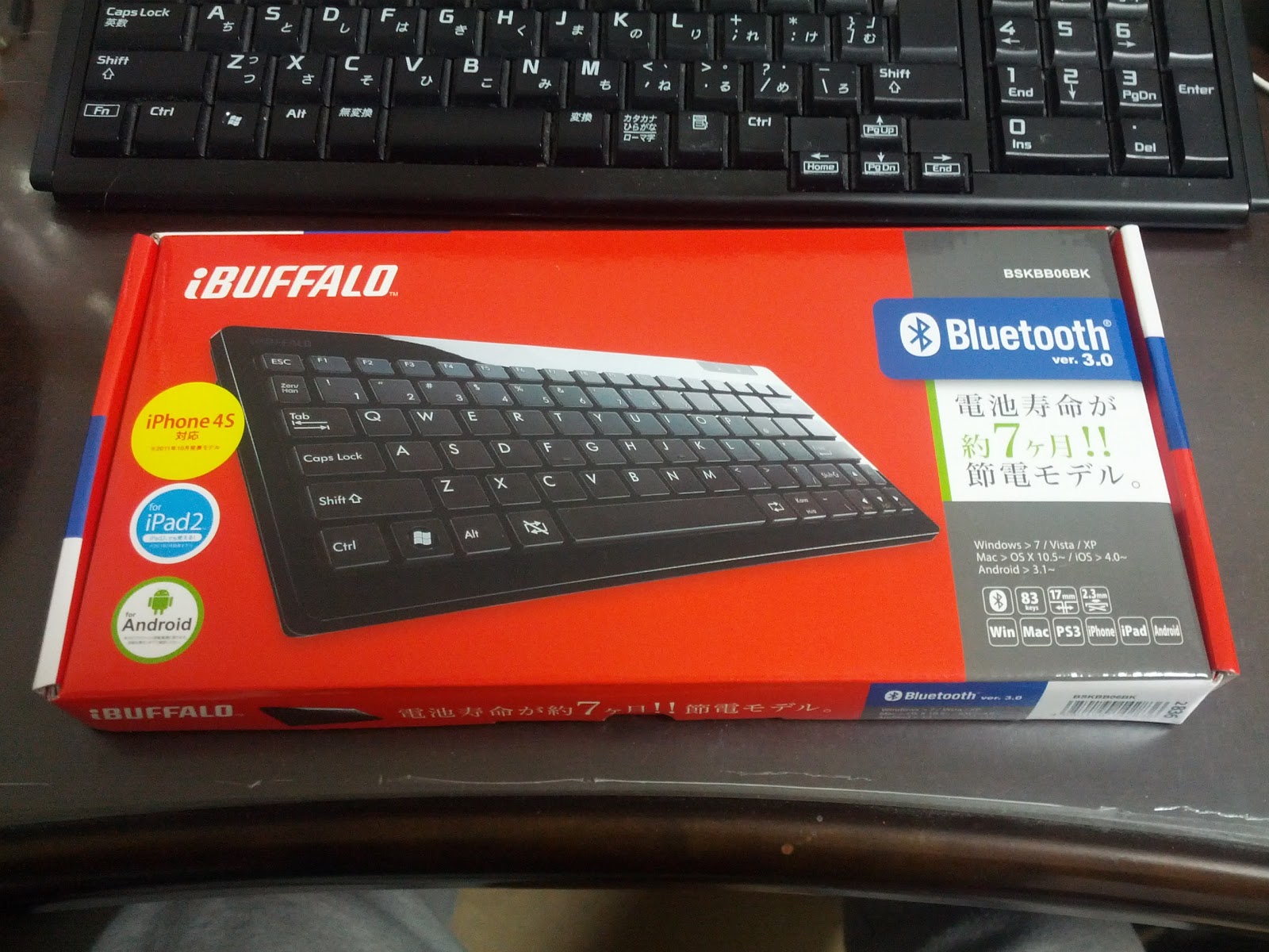 そーゆーワケでなんのネタにもなってないNexus 7だけど、この大きさってスクリーンキーボードを出したときに、iPadみたいにタイピングするほどのサイズではない感じで、でもフツーのスマートフォンみたいにフリックかって言われると微妙で、どこか落ち着いた場所でメールとかちょっと長い文面書くならキーボードがあった方が便利かなぁ・・・と思って、とりあえずBluetoothキーボードを買ってみた。iBUFFALOのBSKBB06シリーズ。